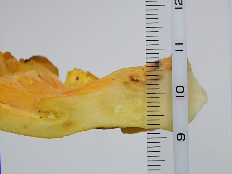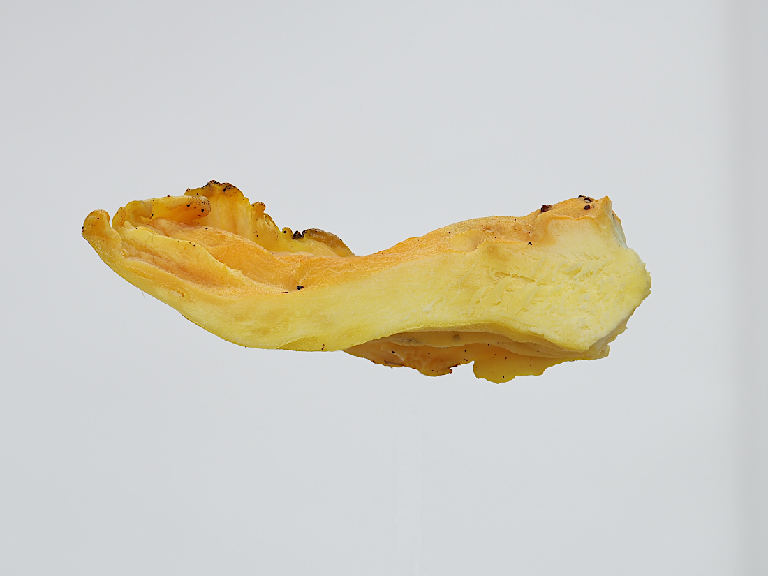 傘:扇形~半円形、環紋状に全体が鮮黄色-橙黄色→白色