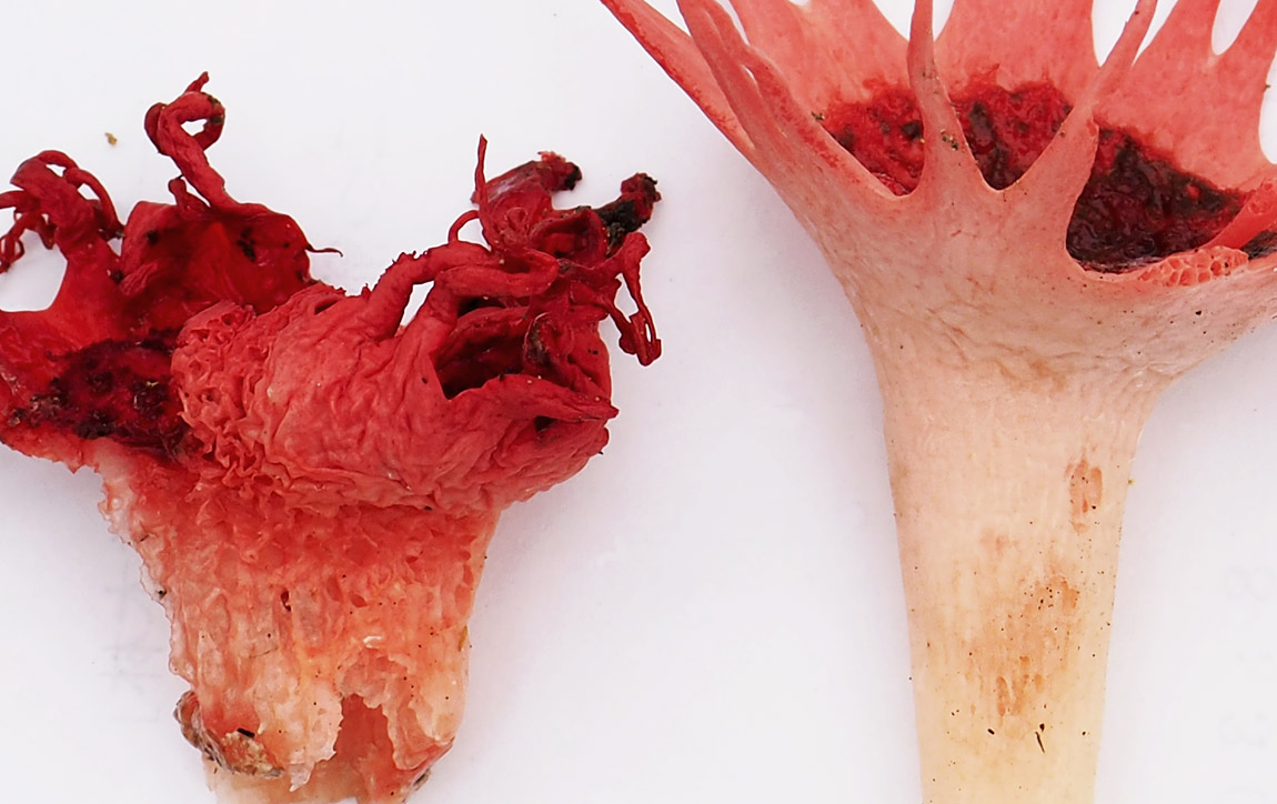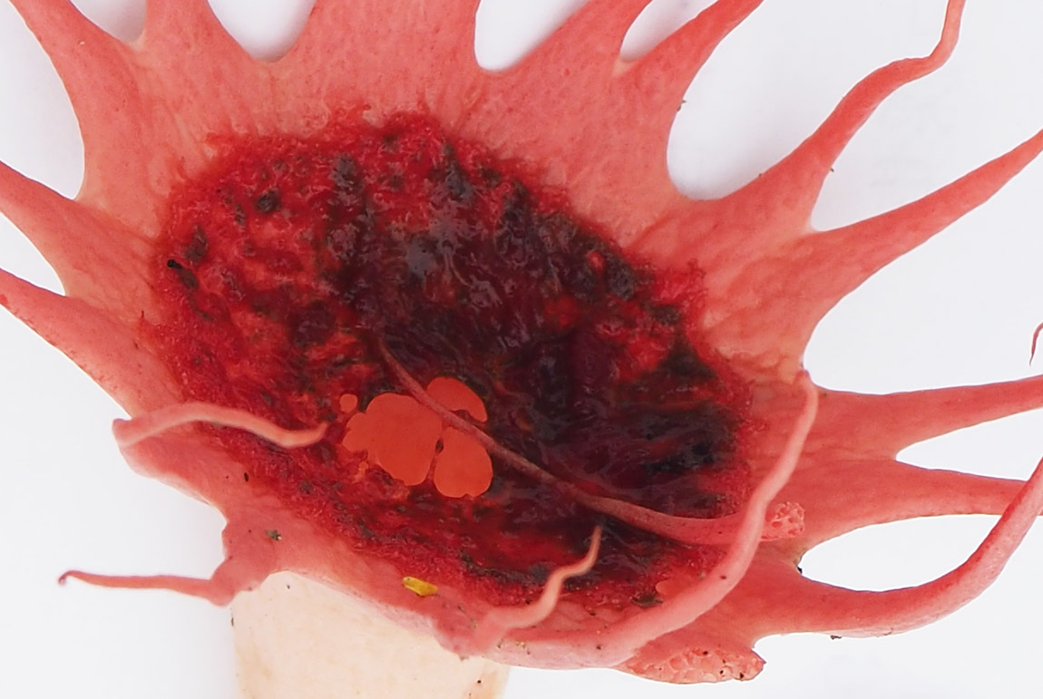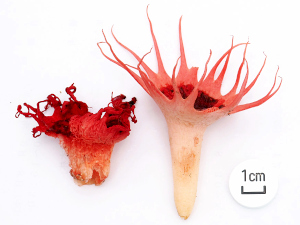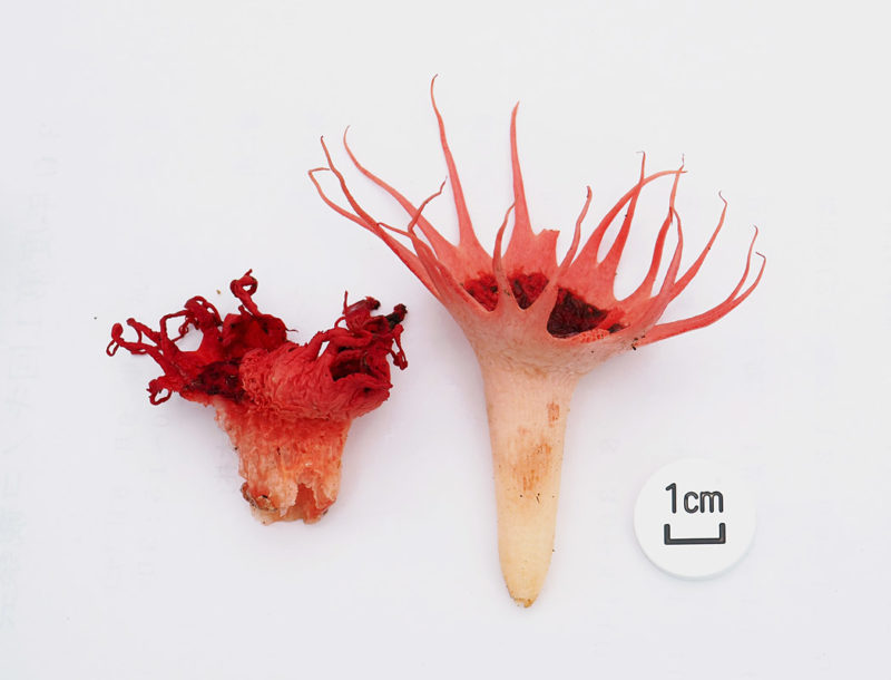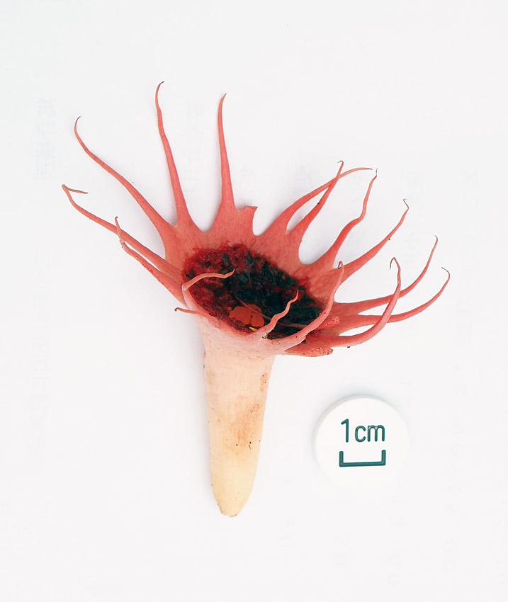 アカイカタケ(Aseroe rubra) きのこ観察記録 Twitter Facebook はてブ Pocket LINE コピー 2025.03.14 2018年(平成30年)09月08日現在で、東北地域初確認と思われる。野外で出会うとまさに赤い烏賊(イカ)が地面に刺さっているいるように見える。 2018年(平成30年)09月08日 撮影地 浜通り