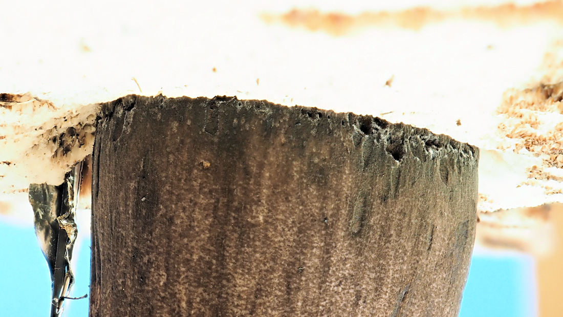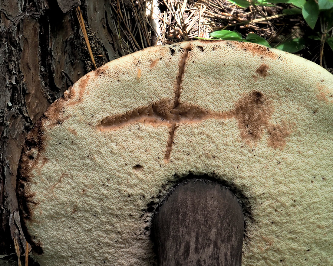 オオクロニガイグチの特徴の柄の頂部が傷んで、網目の存在を確認できないのが残念だ。