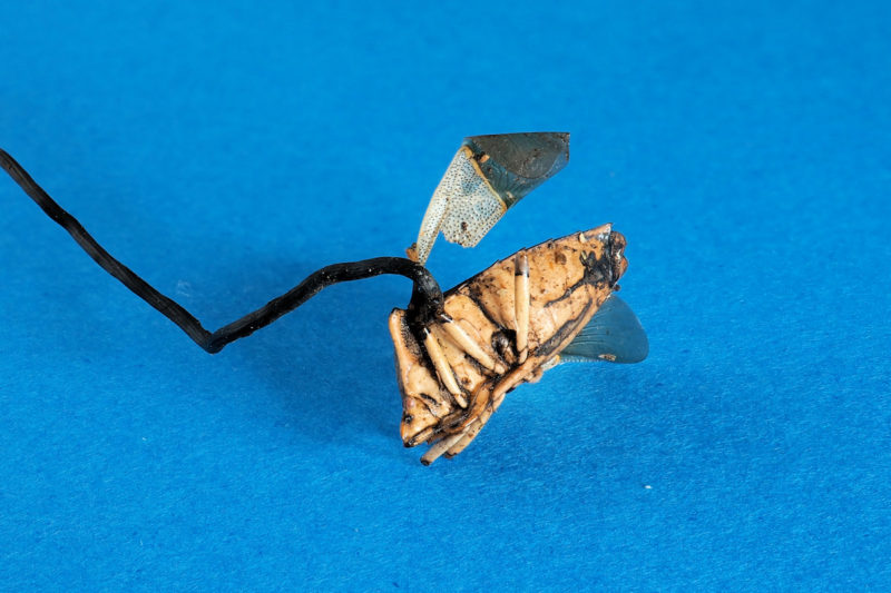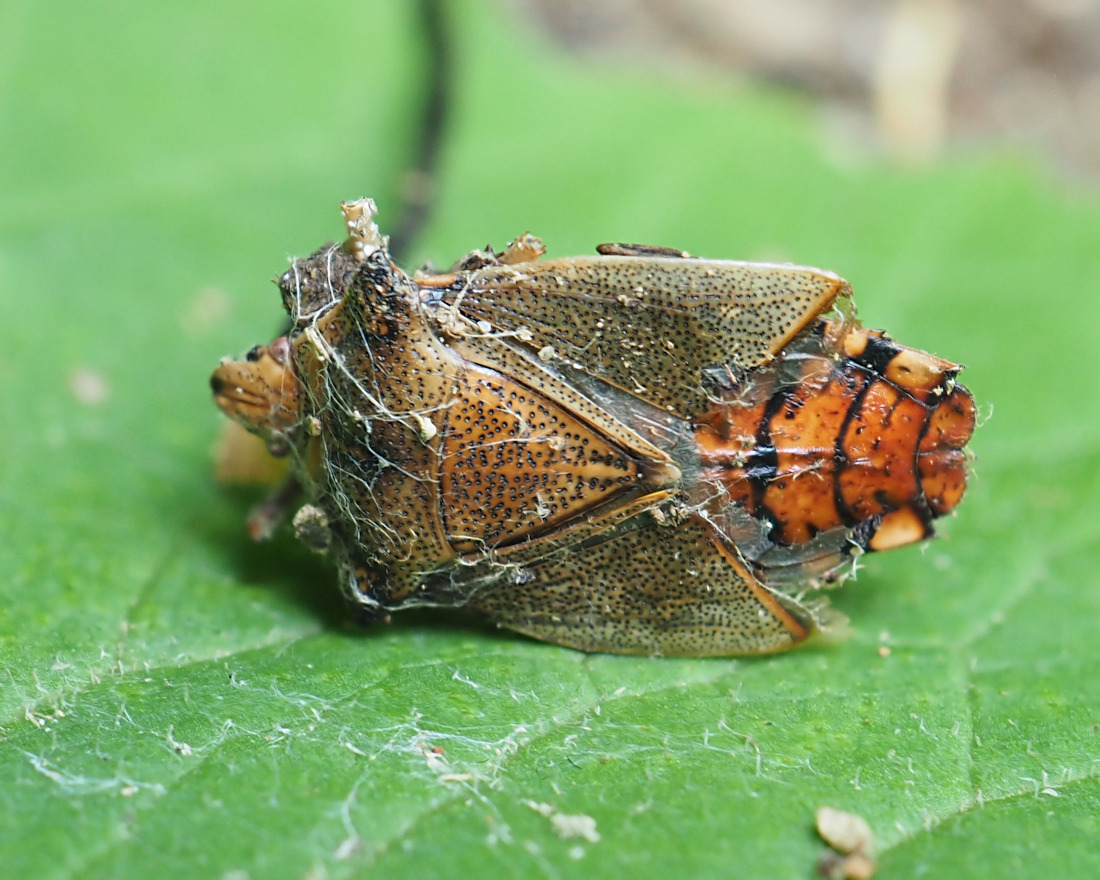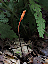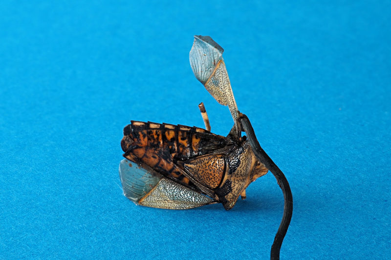 冬虫夏草の仲間でカメムシから発生するきのこ。一般的に宿主のカメムシは地面に接しているか、地面に埋まっているので、カメムシがきれいな状態で観察されることは少ないと思われる。ところが稀にだが落ち葉の間に挟まるような形で、カメムシがきれいな状態で観察されることがある。そのようなカメムシタケに出会ったときは「ラッキー!!」って叫んでしまいたい気持ちになったりする。