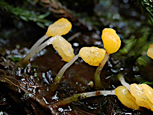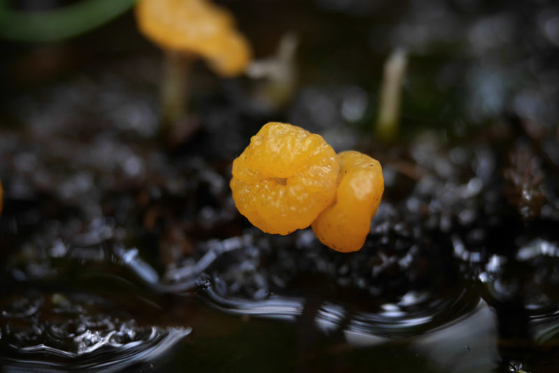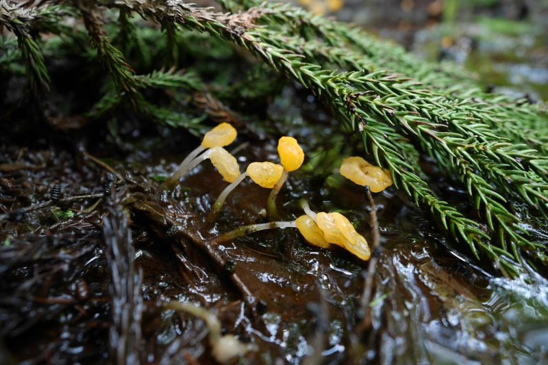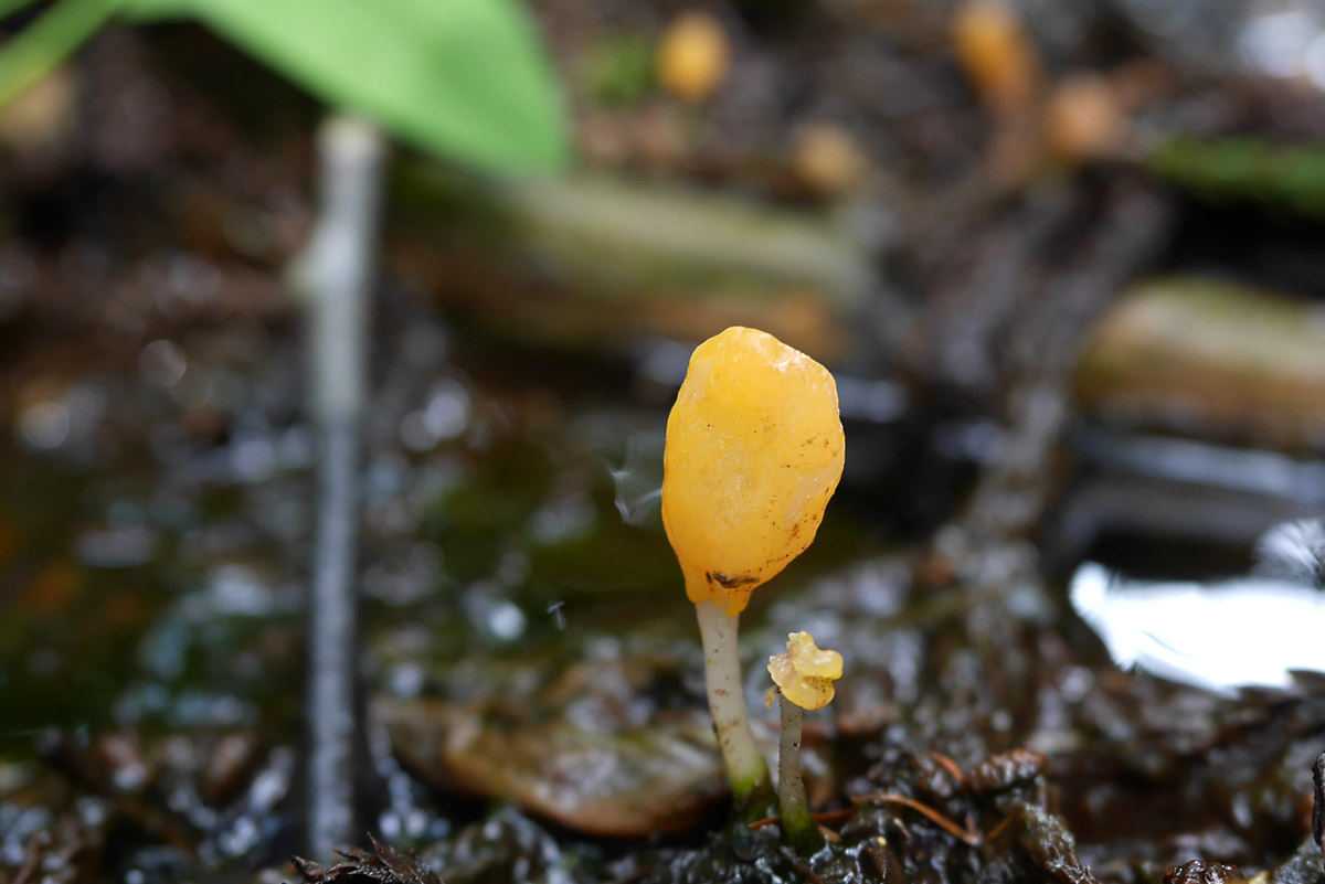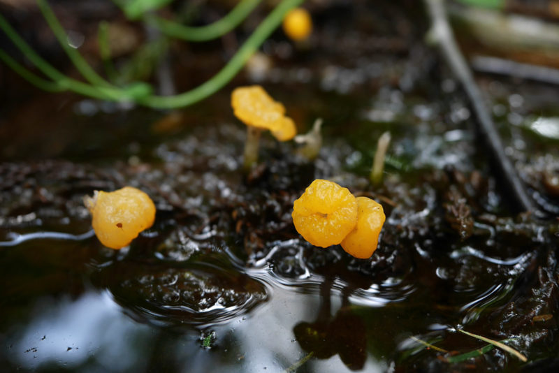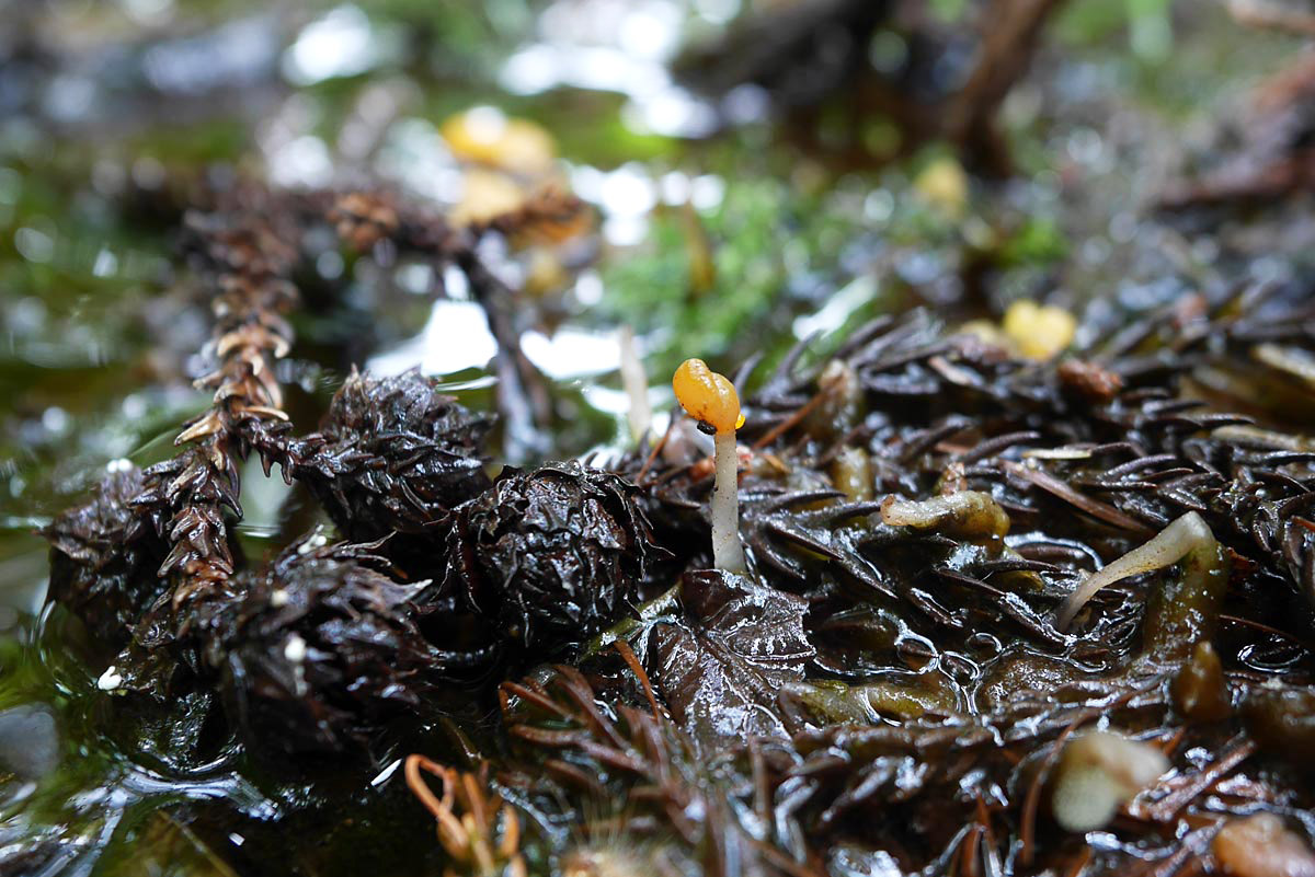 このきのこの大きな特徴は、水の中からでも発生することだろう。具体的にはスギ林など針葉樹林内の湿地や水たまりの落ち葉、落ち枝-腐朽材などの上に発生する。