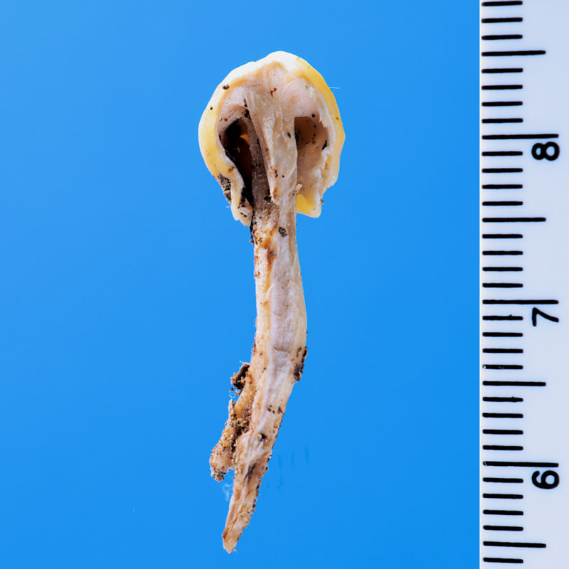 私は、発生し時間がたって傷んだのこだと思い、気にも留めず写真を撮ることをしなかった。ところが、この日の講師の一人だった大ベテラン会員の方が「このきのこはゴンゲンタケだ」と教えてくれた。初めて聞く種名に私自身の頭の中に「???」のクエスチョンマークがいくつも付いた。鑑定会の会場で図鑑を調べてみると図鑑に掲載されていたので、ベテラン会員の慧眼に感服したことを記憶している。