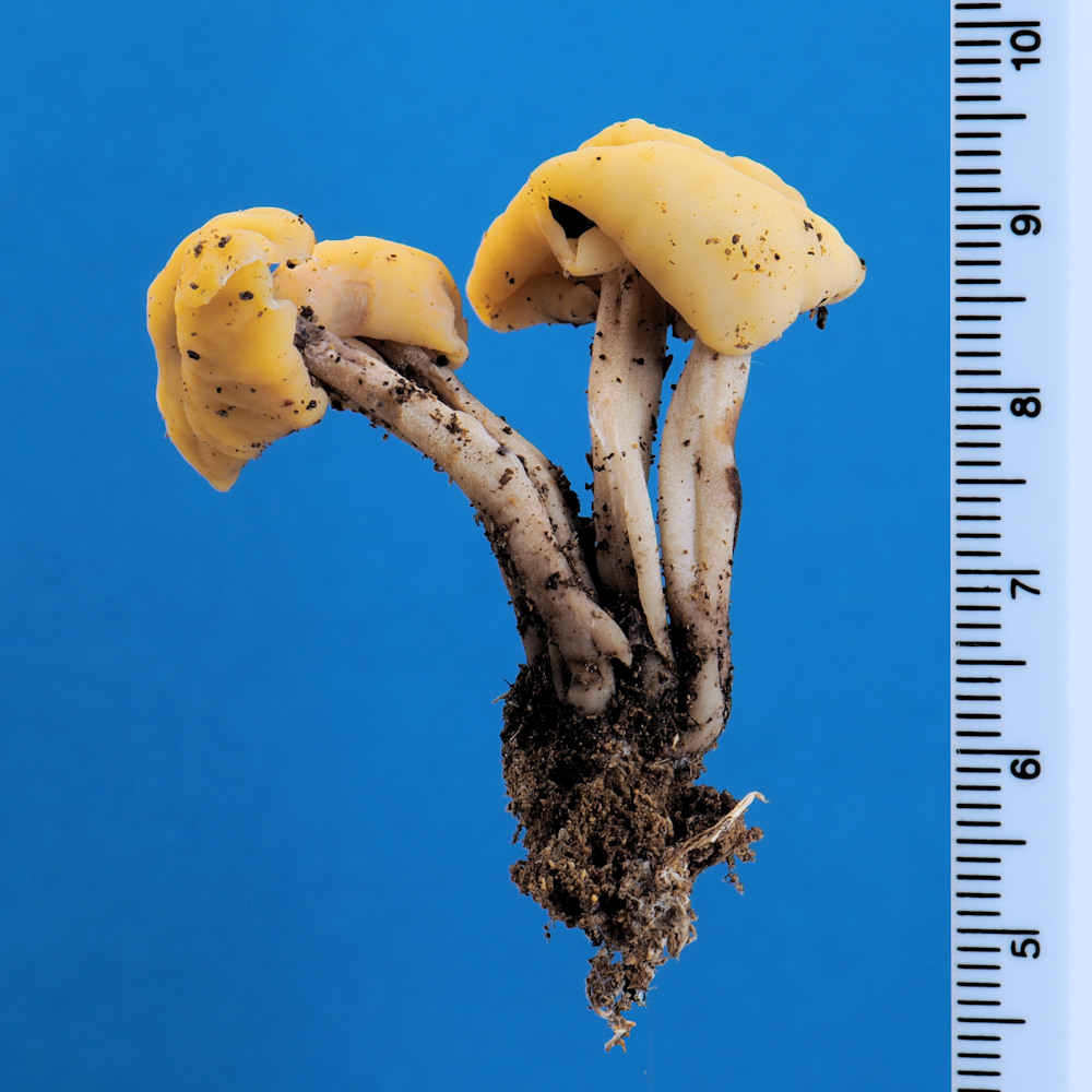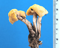 あるきのこ教室で講師の一人として参加した観察会で、このきのこの群生しているところに出会った。