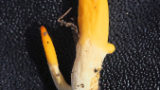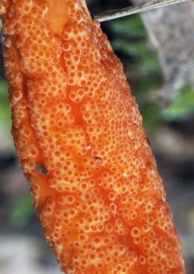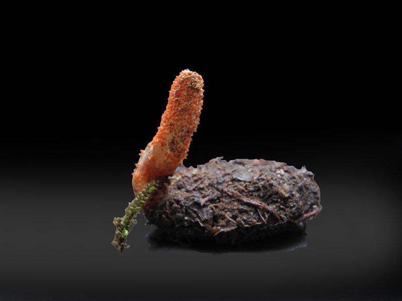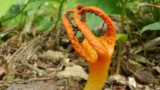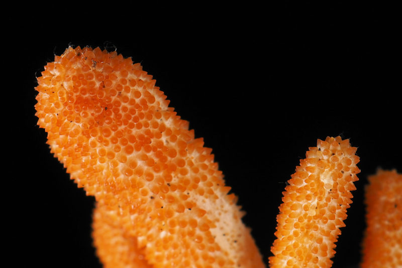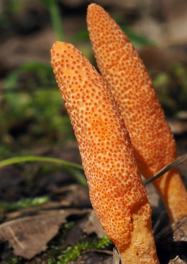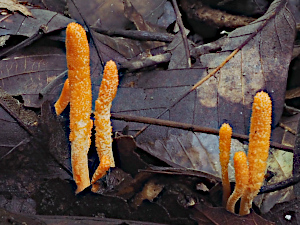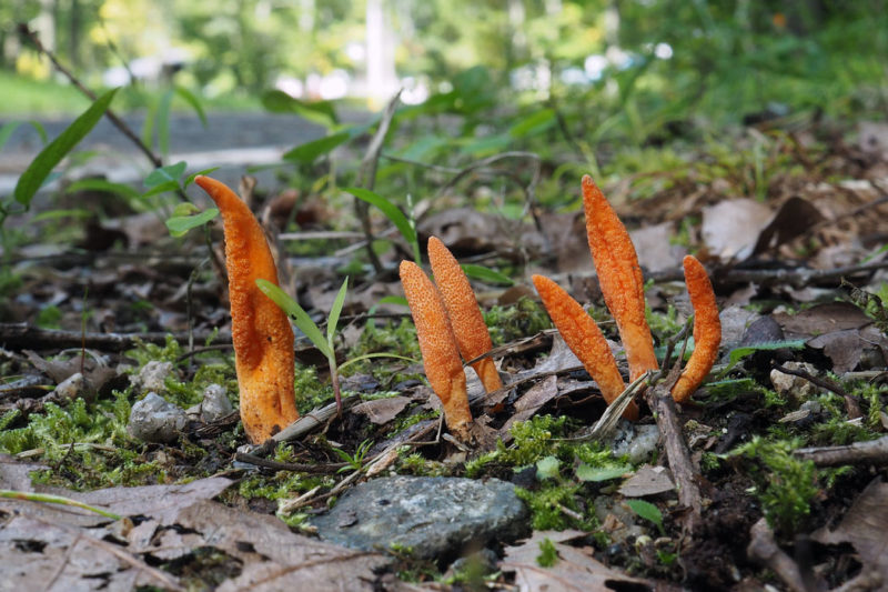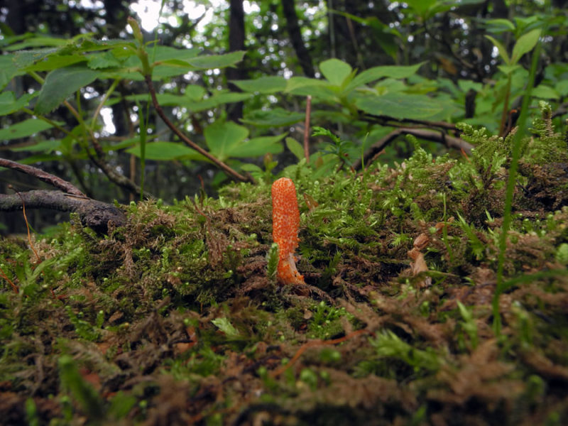 冬虫夏草の仲間で、その名のとおり昆虫の蛹(さなぎ)から発生する。地面に出ている部分は遠目にも鮮やかな朱橙色をしている。私にとっては出会うととてもうれしいきのこの一種だ。