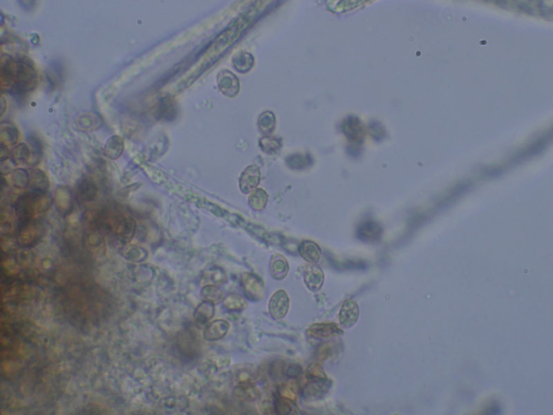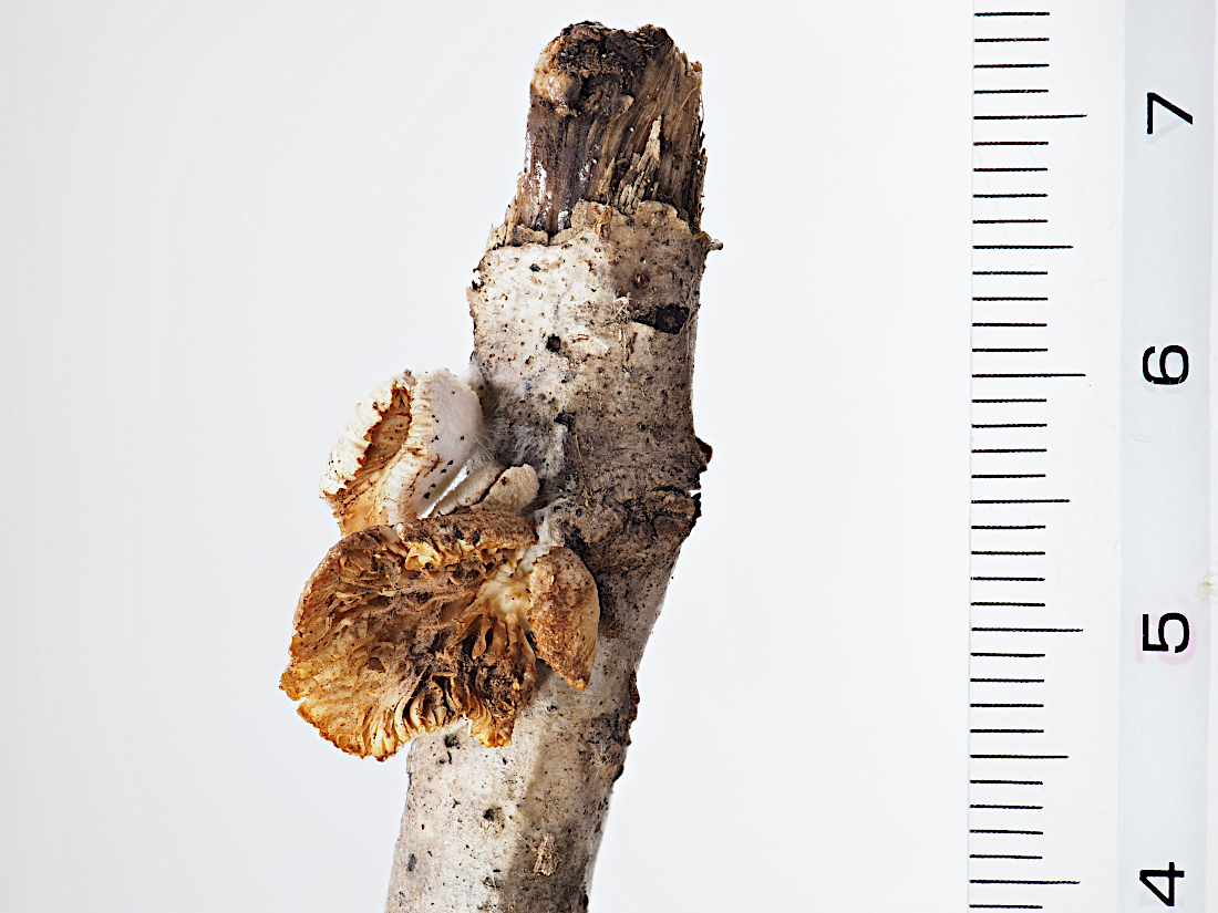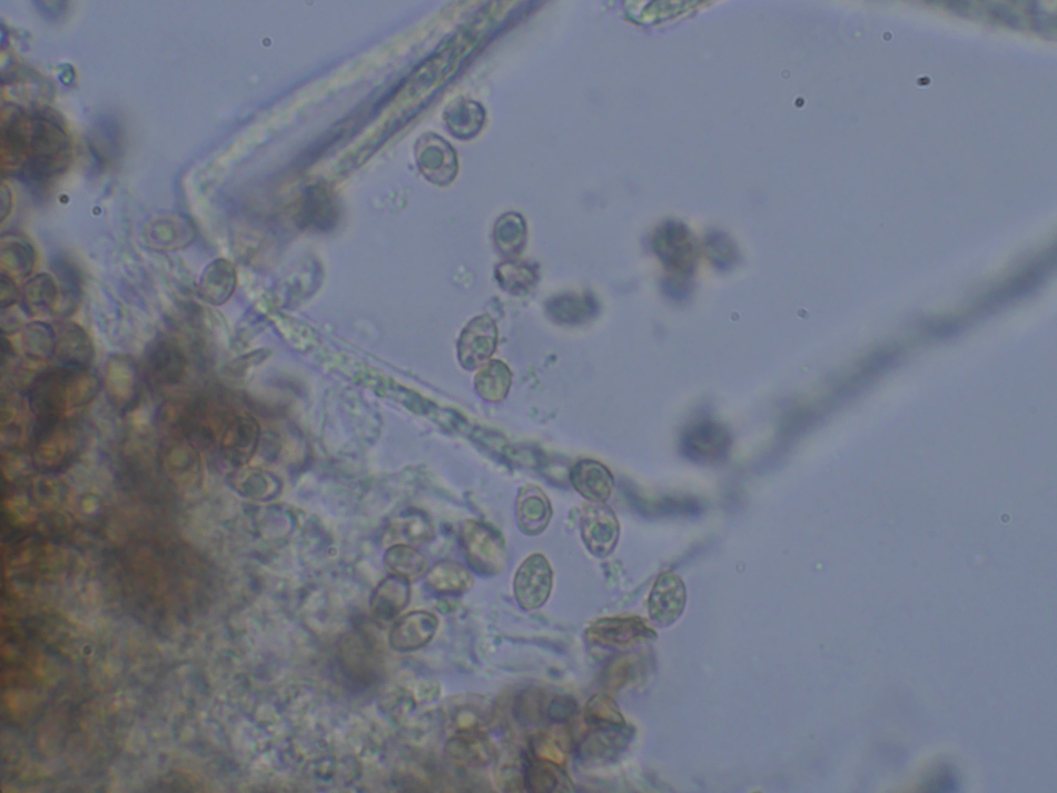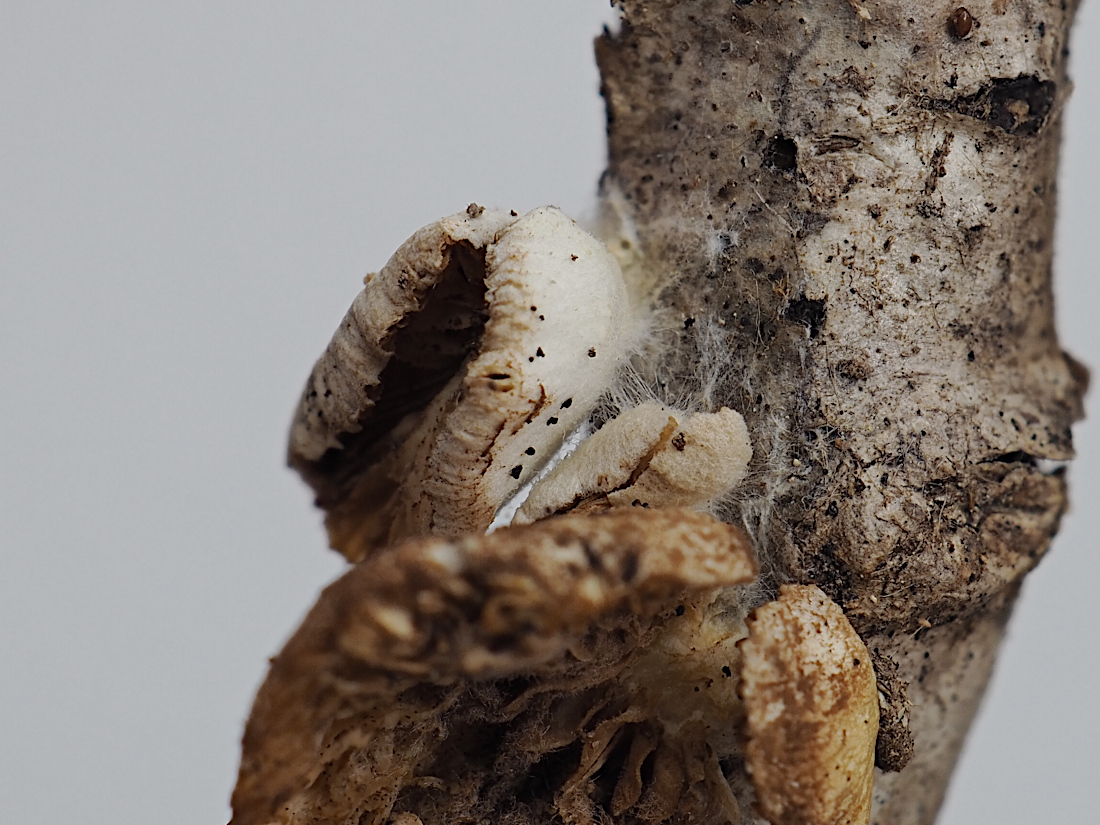 ニセコナカブリ(Crepidotus subsphaerosporus) アセタケ科 チャヒラタケ属 きのこ観察記録 Twitter Facebook はてブ Pocket LINE コピー 2024.08.19 ニセコナカブリ[2024年(R06)07.06] 福島県浜通り 発生時期と発生地:広葉樹の枯木-倒木-落枝に発生する傘:1~3㎝ 腎臓形 フェルト状表面は白色柄:柄は無く背面で基物に付着 基物に付着部分に白毛が密生 ヒダ:白色→帯褐黄土色 密-やや疎 ニセコナカブリ ニセコナカブリ ニセコナカブリ ニセコナカブリ胞子 ニセコナカブリ胞子 ニセコナカブリ胞子測定表