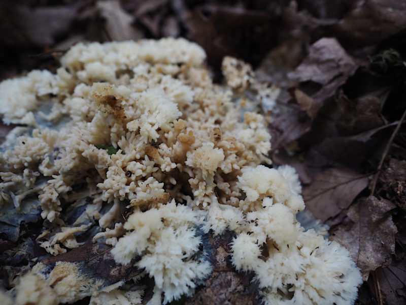 今まで観察できたロウタケは落枝などに絡まるように発生しているものばかりだったが、今回観察できたものは、落ち葉が5cm以上堆積した上に発生していた。その広がりは15cm×25cm余だった。果たしてロウタケでいいのだろうかと思う気持ちもある。