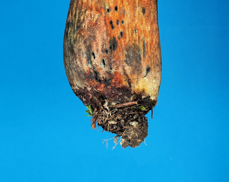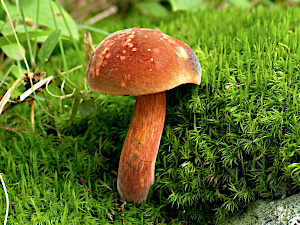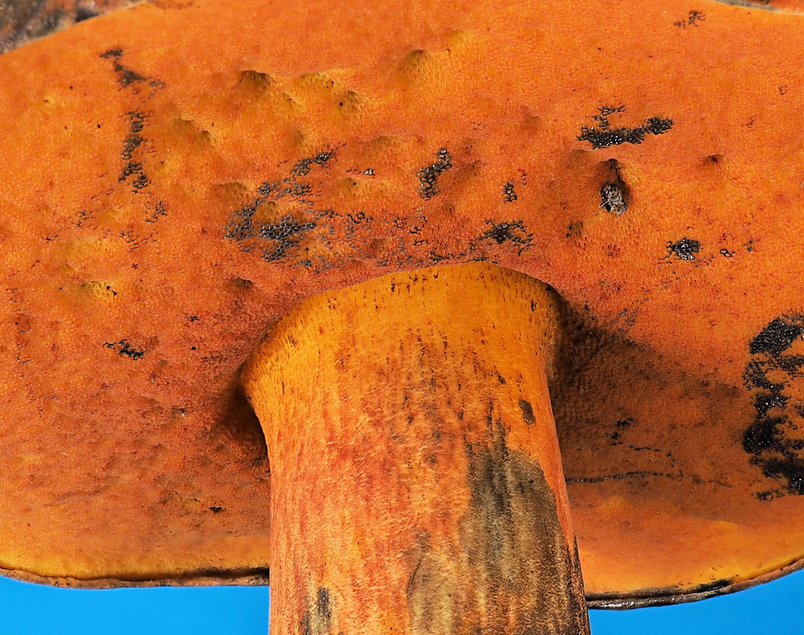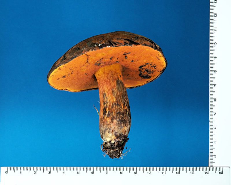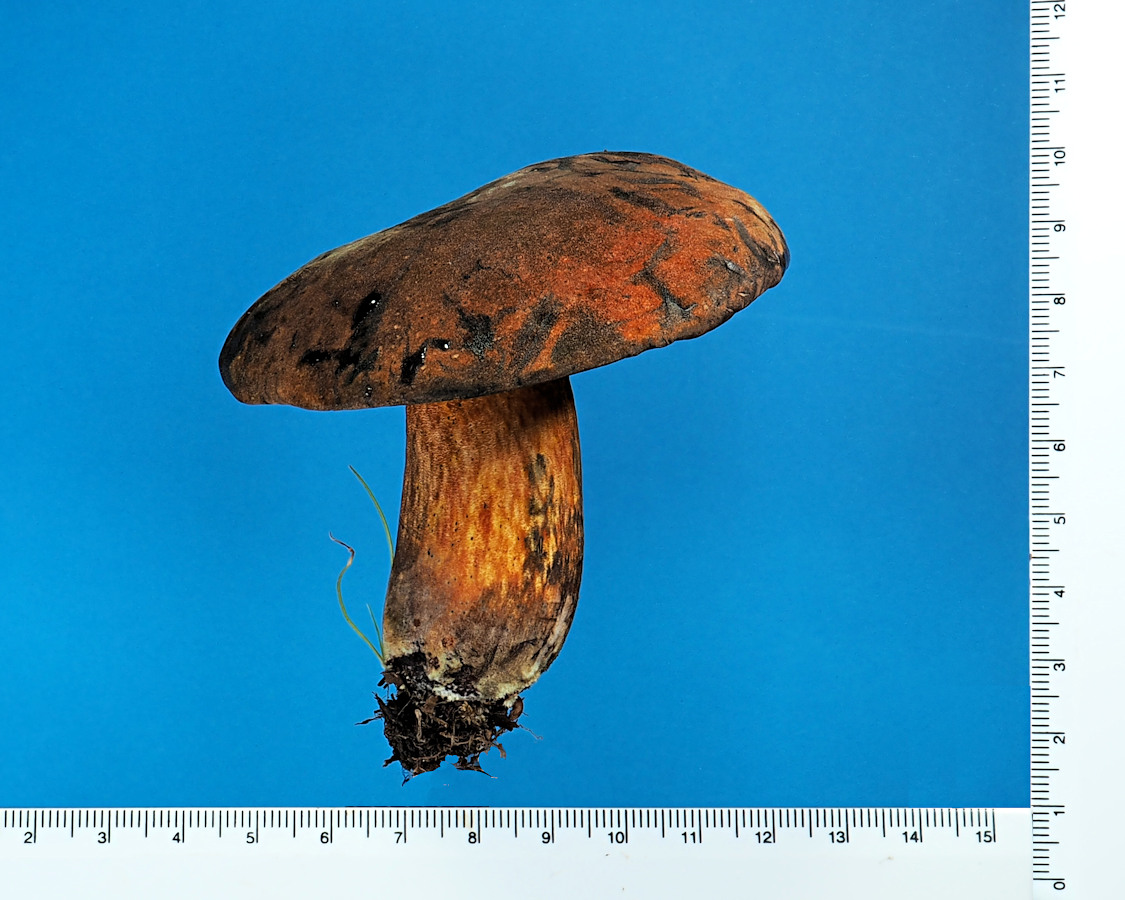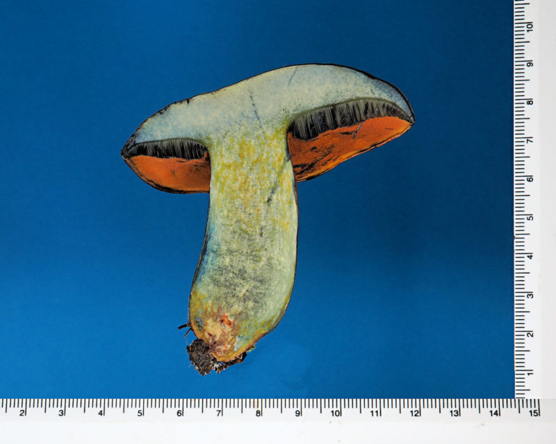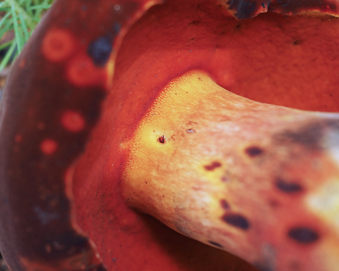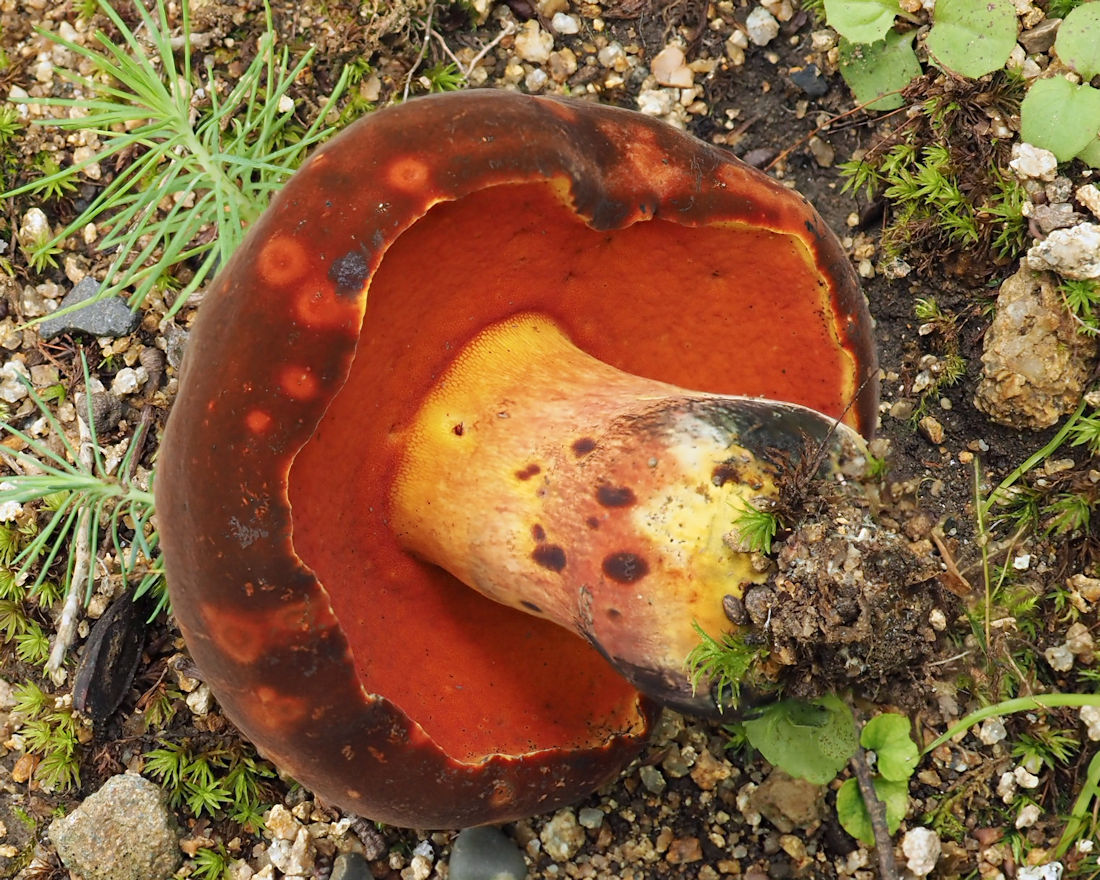 基部から赤みを増す子実体あり。針葉樹林下に発生するものは「成熟すると柄の基部の肉が赤くなる」とのご意見をいただいた。広葉樹林下のものはならないようだ。また、傘の赤みが強いものや柄の頂部に網目を表すものと無いものがあるそうだ。胞子のサイズも違うらしい。