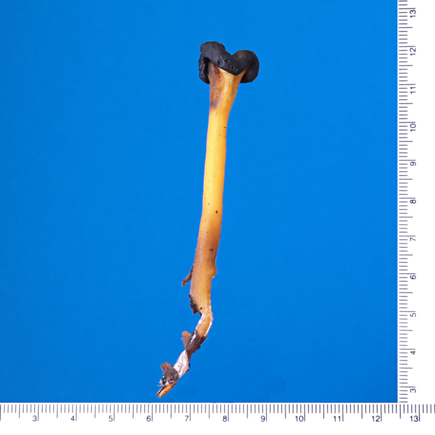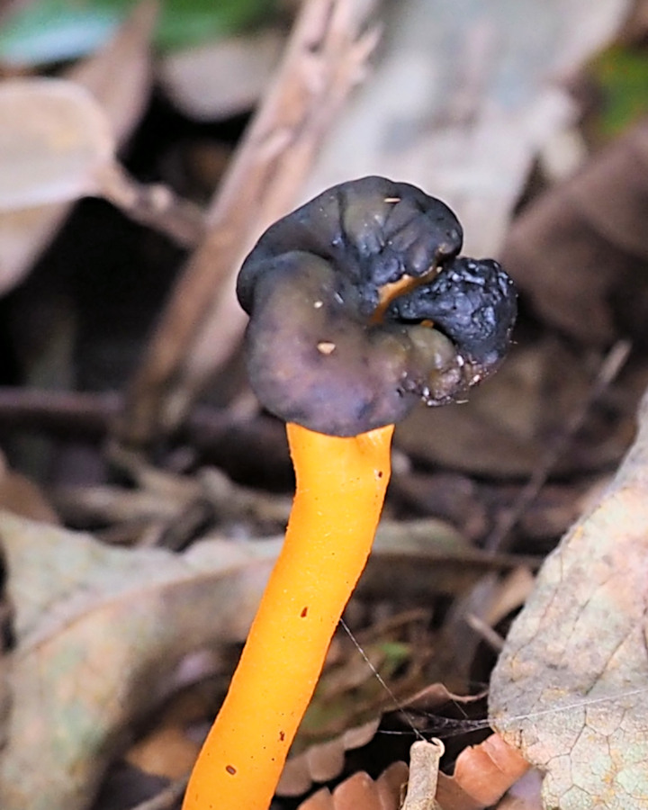 アカエノズキンタケ(Leotia stipitata)ズキンタケ科ズキンタケ属 きのこ観察記録 Twitter Facebook はてブ Pocket LINE コピー 2022.04.17 アカエノズキンタケ[2020年(R02)10.06] 浜通り 着飾った森の妖精きのこたちの密やかなパーティ。アカエノズキンタケとムラサキアブラシメジモドキ?と白い不明菌暗い林床だったので照明を当てて撮ってみた。 頭部の子実層面は、図鑑によると緑色~暗緑色とのこと。この子実体はかなり濃色なので、別種の可能性があるが、柄が黄橙色で粒点が散在することからアカエノズキンタケとした。 OLYMPUS DIGITAL CAMERA OLYMPUS DIGITAL CAMERA OLYMPUS DIGITAL CAMERA