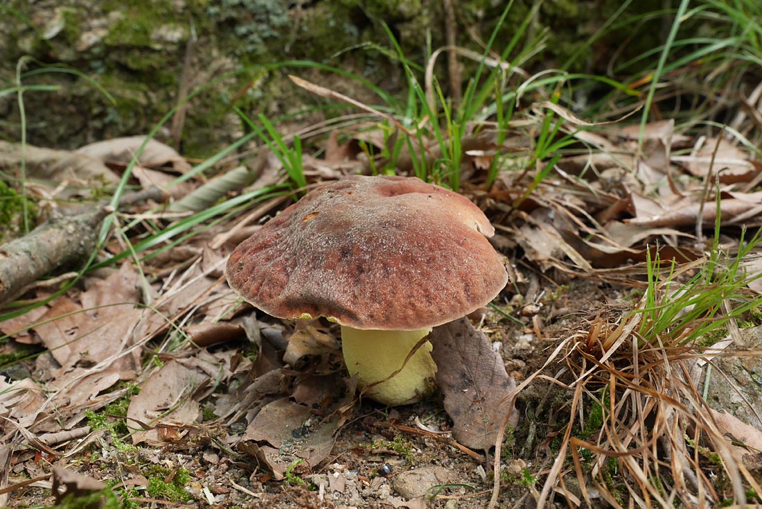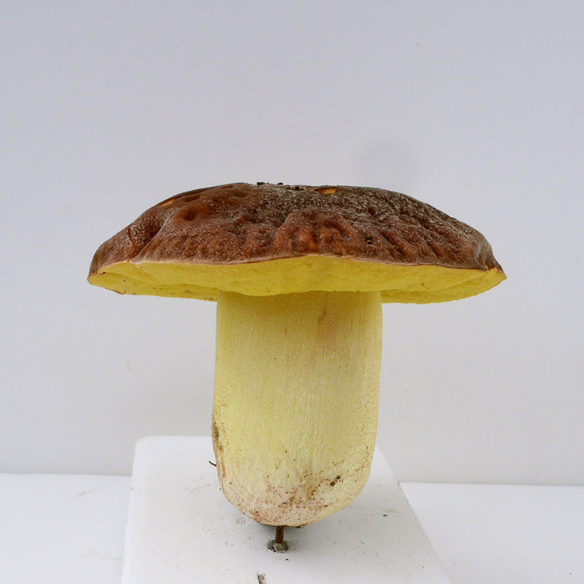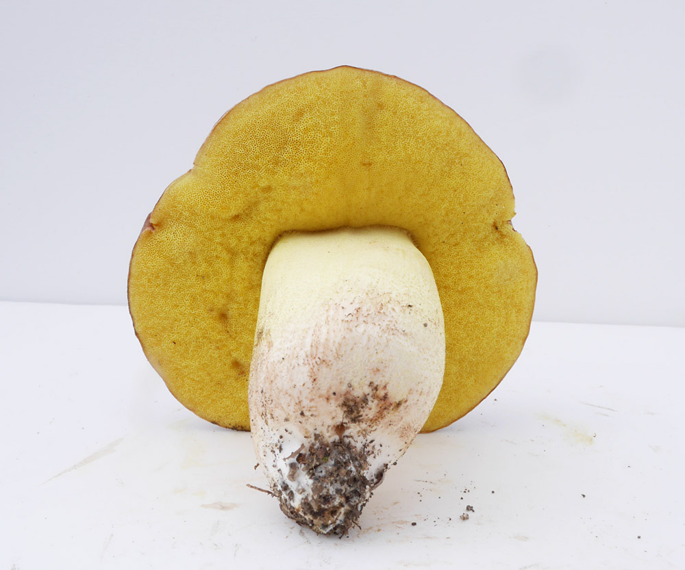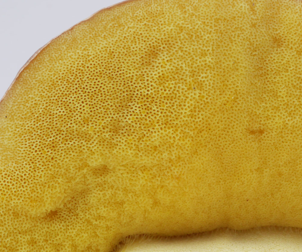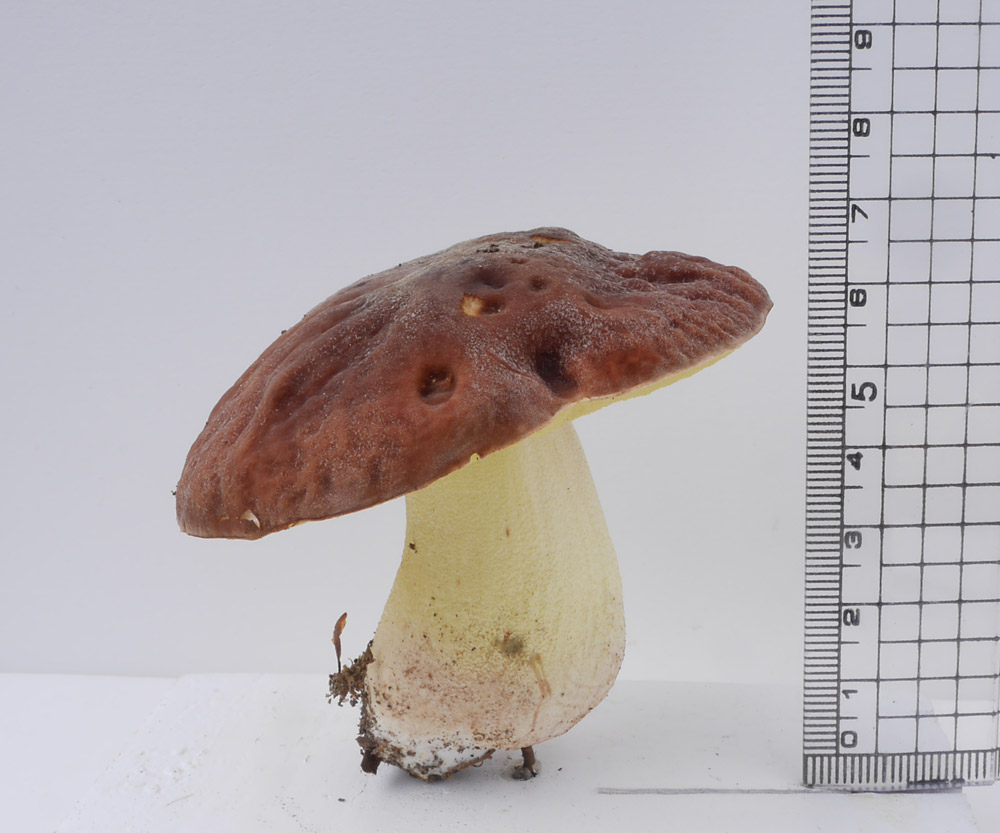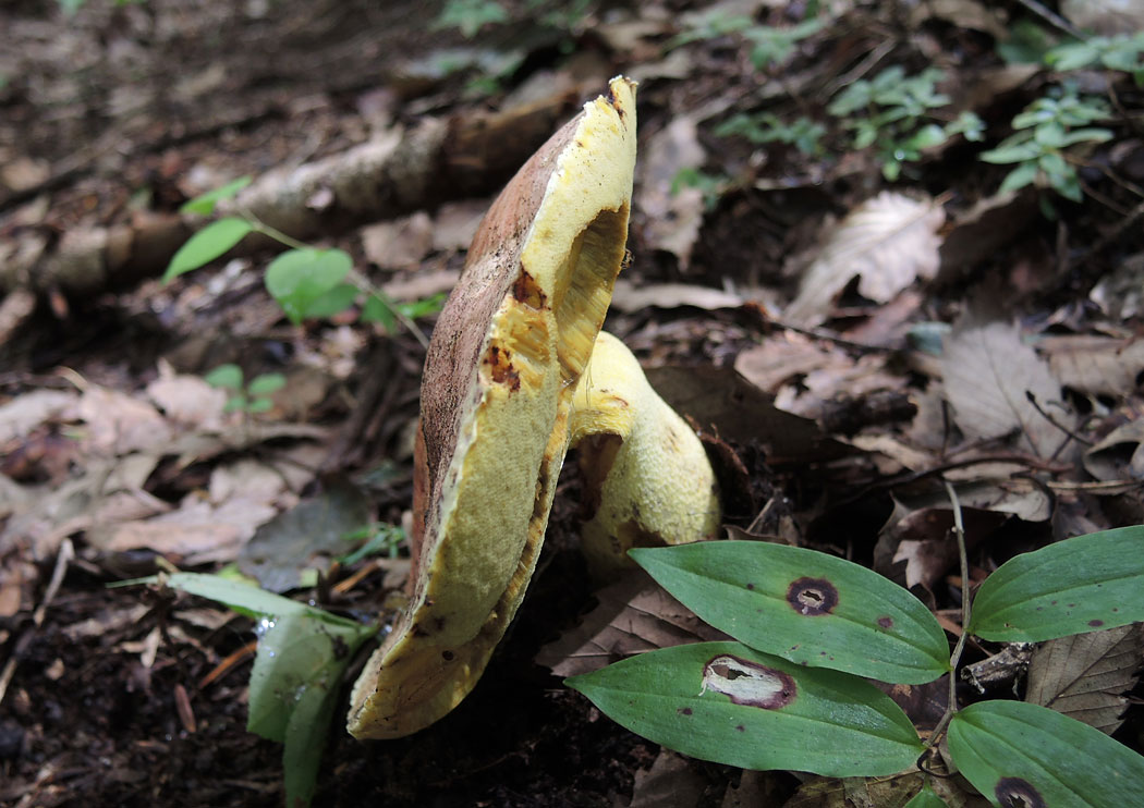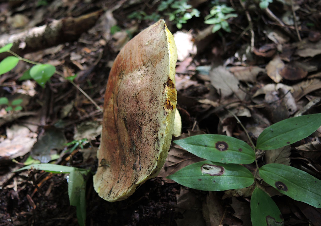 傘表面のボコボコ感がちょっと気になるが、管孔を傷つけても変色しないのと切断面の様子からアカジコウとした。シワチャヤマイグチも検討したが、広義のアカジコウとして掲載することにした。