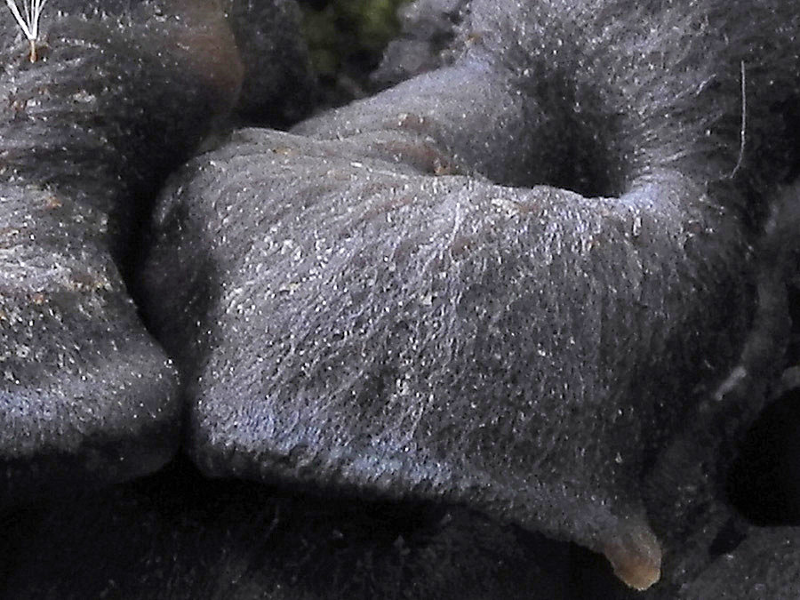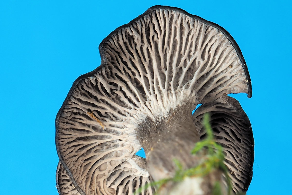 アクイロウスタケの特段の特徴は傘の裏です。ひだがいくつにも分岐し、さらに脈で連絡しています。全体が黒褐色→濃灰褐色になり、。成熟したものは縁部が著しく波打つことがあります。