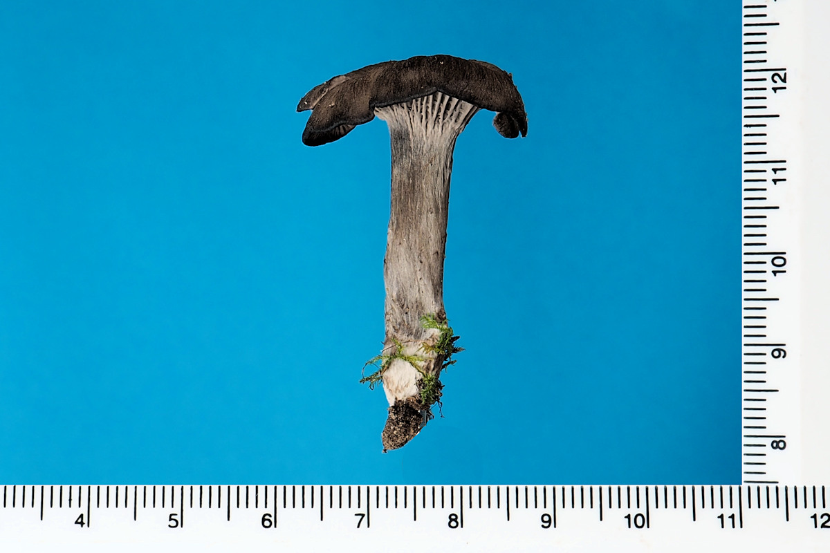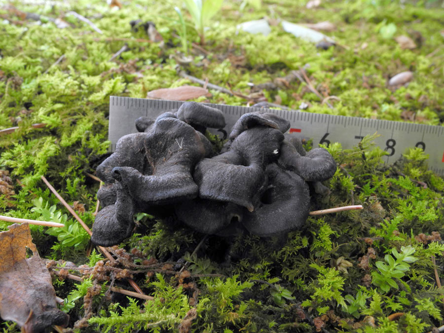 アカマツとコナラ類の混生林地上に発生していた。この子実体を見て最初に思ったのは、「成熟しきって黒くなってしまったきのこかな」だった。でも,それでいつも失敗するので、今回は1個だけ採って確認したら、まだ若くて黒いきのこだった。