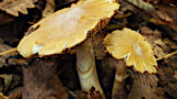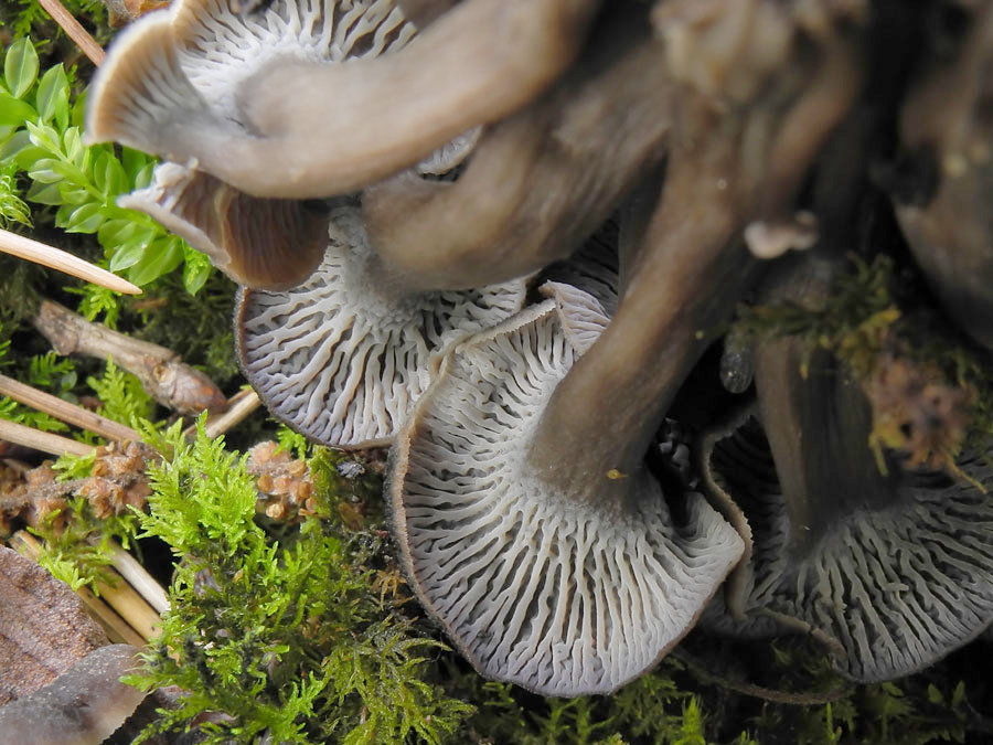 似た種にコクロラッパタケがありますが、コクロラッパタケはひだが脈状で放射状に並びます。アクイロウスタケのひだは脈状しわひだが不規則に連なり網目状です。