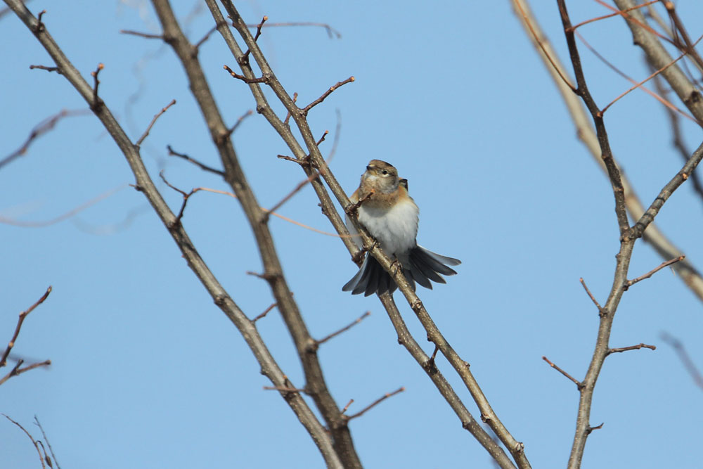 この場所は水場となるごく小さな水路があり、周辺に積雪があると様々な野鳥が集まってくる。三脚を据えてじっと待っといると、やがて小鳥たちが水浴びにやってくる場所である。アトリは小鳥の中でも小さい鳥だ。警戒心が強いのかすぐに飛び去ってしまう。今回は比較的じっとしていた。