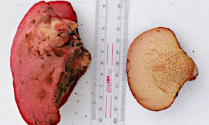 きのこ観察記録 カンゾウタケ(Fistulina hepatica) その名のとおり正に見た目が肝臓のような形だ。切断した断面も肝臓のように見える(気がする)。生で試食するといわゆるきのこ特有の菌臭(例えばナメコ、市販のブナシメジ)がせず、弱い酸味が特徴だ。 [2016年(平成28年)05月31日 ]... 2025.03.09 きのこ観察記録カンゾウタケ(Fistulina hepatica)