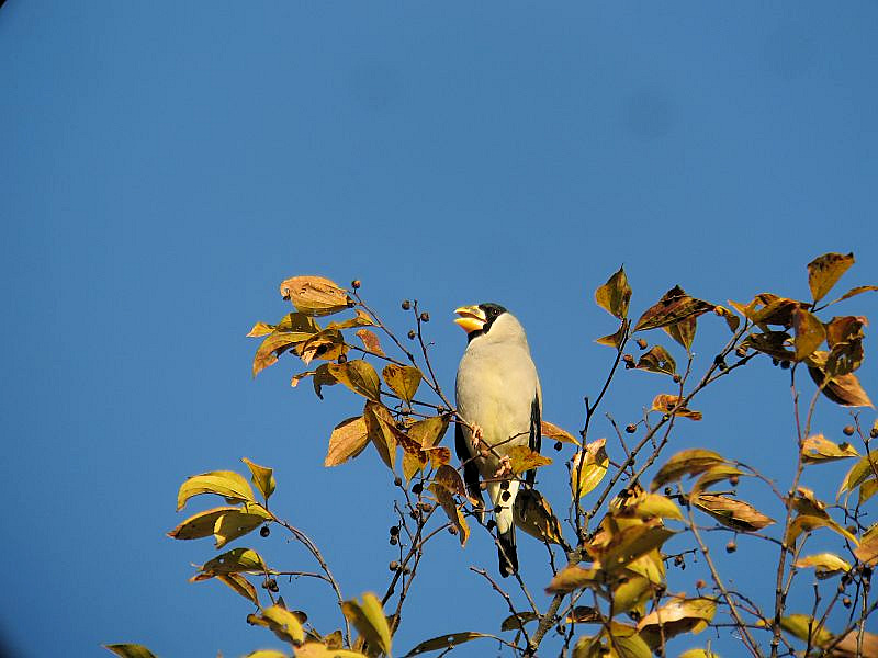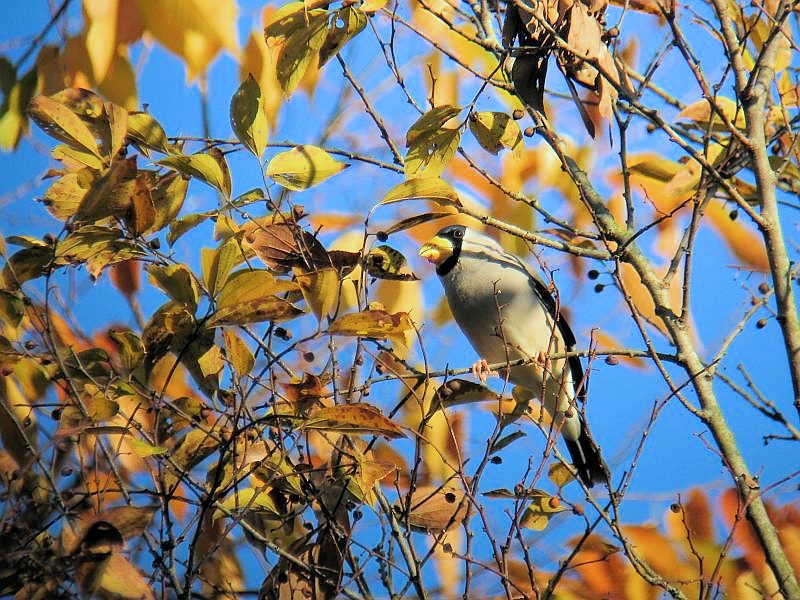 ごく普通に見られる鳥しかいないだろうと思いながら鳥見撮影をしていたら,高木の上の方で太めの鳥が数羽餌をついばんでいた。