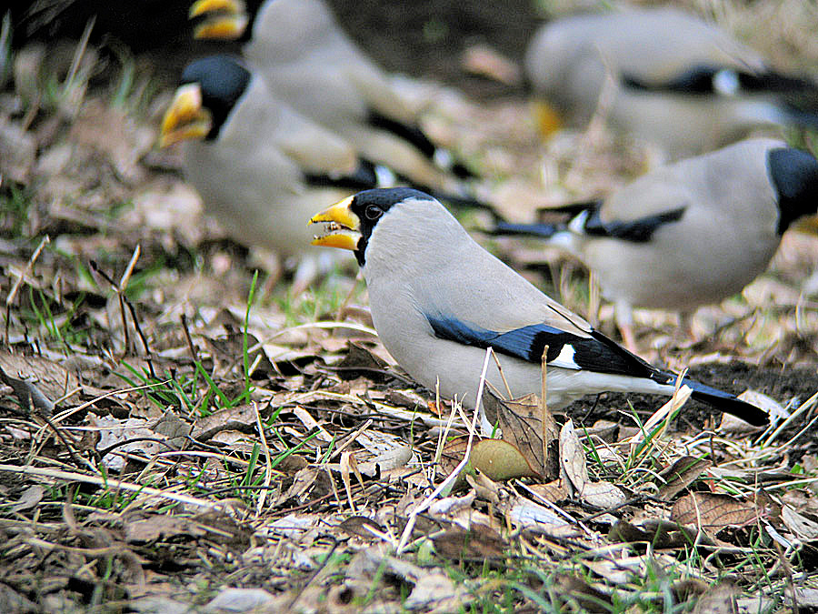 小金井公園西口から園内に入ったら,いきなり鳥の大群が飛んできて,近くの樹上に止まった。話しに聞いていいたので,肉眼でもイカルと識別できた。しかし,事前に情報がなかったら自信を持ってイカルと思えなかっただろう。