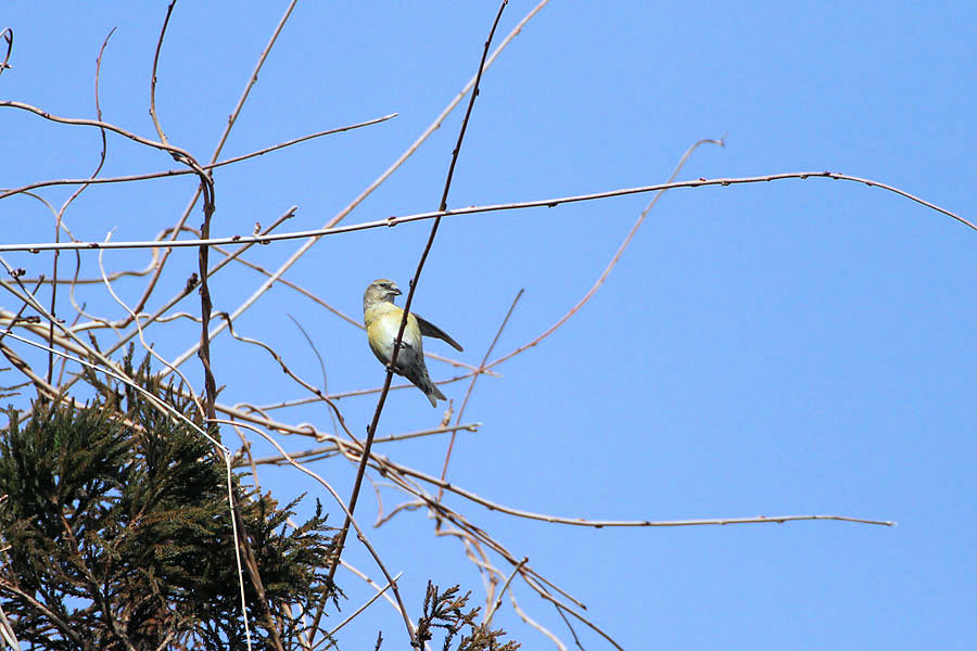 里山を2時間ほど歩く山歩き程度の登山でした。遠目で逆光の高い木の上に、小鳥が数羽止まっているのが見えました。そのうちの1羽はやや大きめです。双眼鏡(10×40)で確認すると、わずかに赤みが感じられます。嘴は太いのですがスッキリしていません。「もしや!イスカでは?」と思い,順光側に回り込み確認すると,全体がやや暗めの赤色です。しかも,嘴が曲がっているように見えます。「あっ!あっ!イスカだ!」と思わず声が出てしまいました。撮影したいのですが、カメラはコンデジのみです。取りあえず証拠写真に数枚連写。帰宅後に確認したらコンデジにしてはよく写っていました。