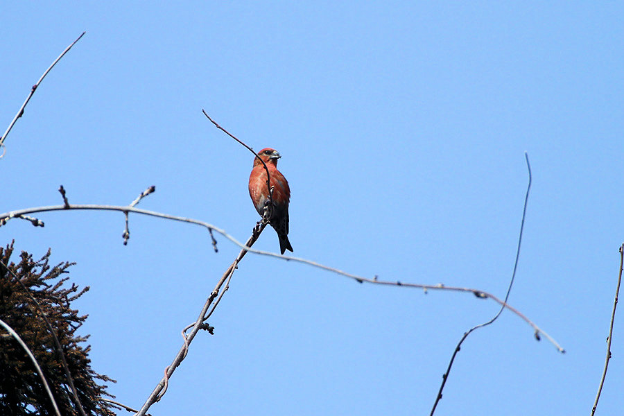 居るかもしれないと若干の期待を持っていたら、高い木のてっぺんにいました。ちょっと興奮しました。体全体が赤いのがオスです。