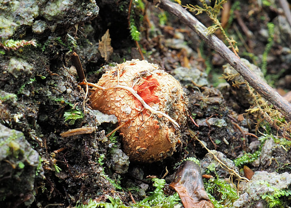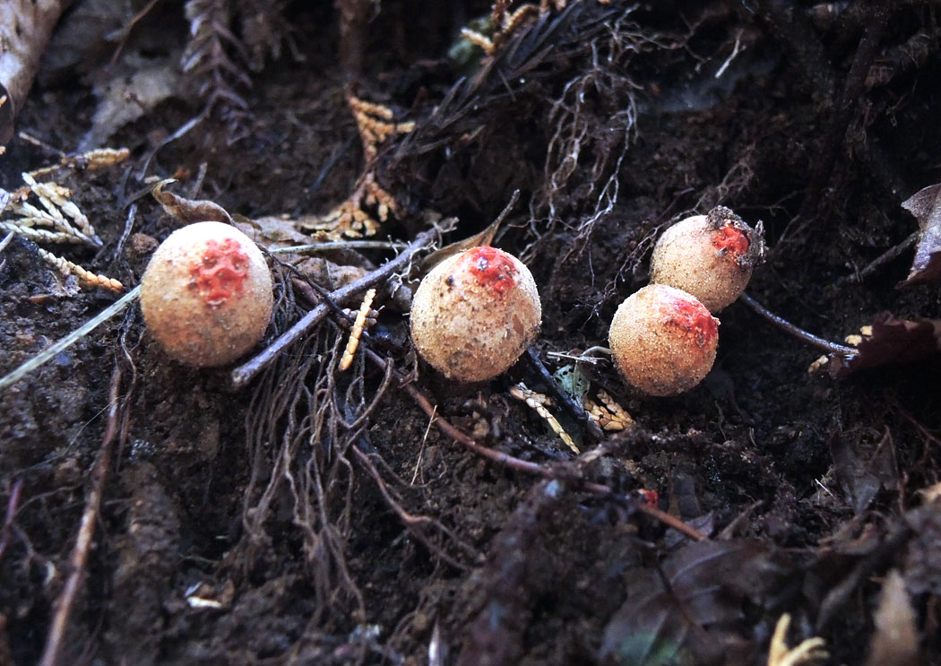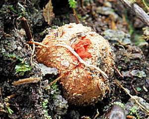 クチベニタケにそっくりな種としてホオベニタケとツチイチジクタケがあります。少なくともクチベニタケとホオベニタケは粘土質の土が露出したところに発生します。クチベニタケは唇に見立てた部分のみが紅色に彩られます。ホオベニタケは唇以外の頬に見立てた部分まで紅色に彩られます。ただ、ホオベニタケの頬の部分は、成熟が進むと退色するので、見分けが難しくなります。ツチイチジクタケ(Calostoma ravenelii (Berk.) Massee)という種はまだ観察したことがありませんが、クチベニタケとは肉眼的形態がそっくりで胞子の形状が違うとのことです。いずれ出会ってみたいきのこです。