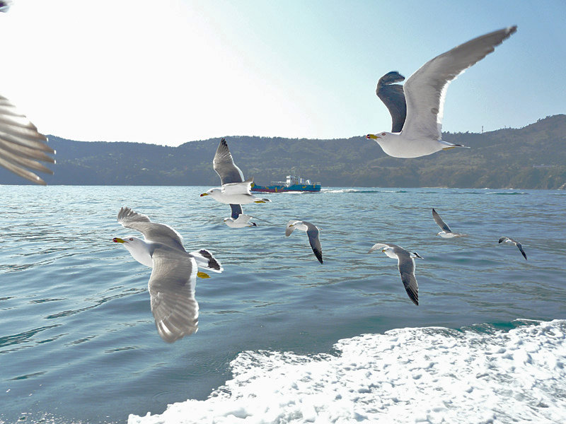 金華山に遊びに行ってきた。帰りの船の周りをウミネコがたくさん飛んでいたので、FZ18で撮影してみた。ひょっとしてミズナギドリなどが飛んでくれないかと思ったけど甘かった。